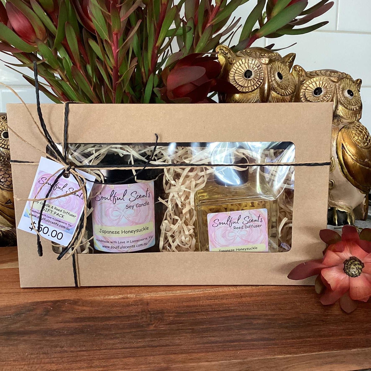The pack includes one medium soy candle, one reed diffuser, and five fibre reed sticks.