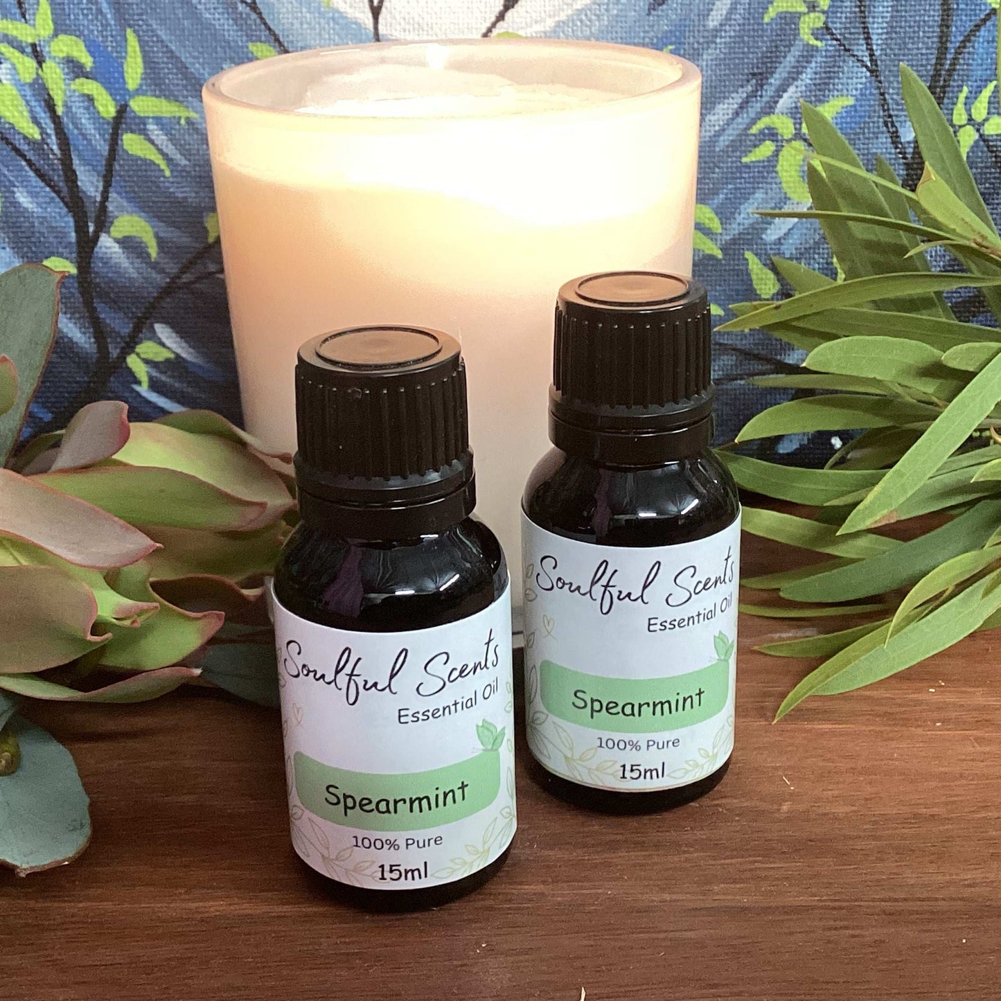 100% Spearmint Essential Oil: (Mentha Viridis Leaf) Properties: Stimulating, Uplifting. Promotes: Emotional wellbeing, focus. Relieves Nausea, itches, headaches, pain & breathing. Insect repellent, anti-inflammatory. Improves mood. Protective against negative energies.